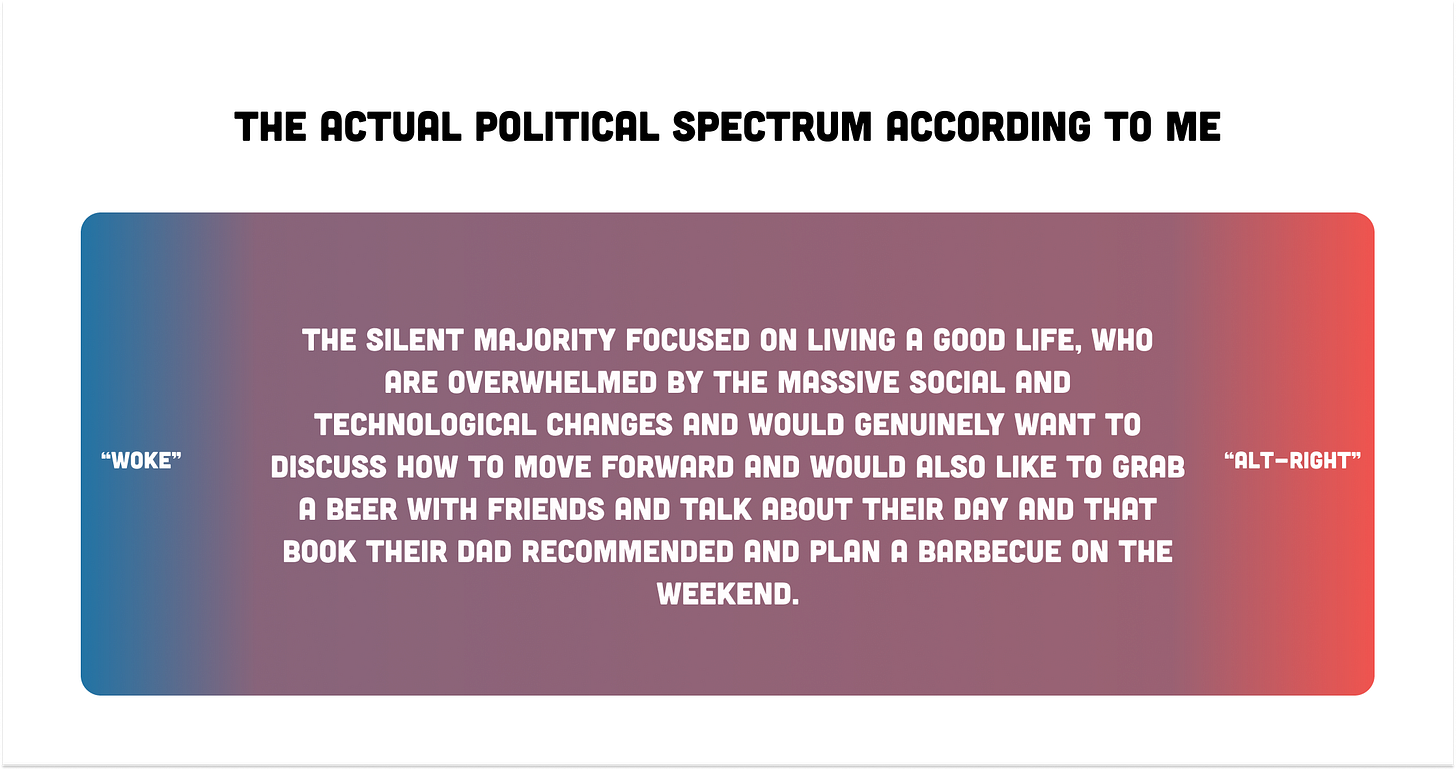 These radicalized, memefied left and right-wing narratives only offer one path forward. The “right” path. All else will bring chaos and depravity to the world. We—the majority—are pressured to pick a side on this seemingly inevitable choice. It’s either-or. And once we choose, we must accept all the other assumptions. If we want free-market policies then we must be socially conservative, like “right-wing” people are. If we want liberal policies regarding gender, then we must lean into the power of the state.
